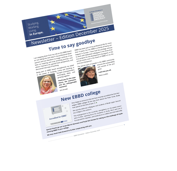 EBBD is European joint certificate of excellence with a focus on business, Europe and internationalisation. It equips learners with the necessary competence to master extensive soft skills and business competence in an international environment.
